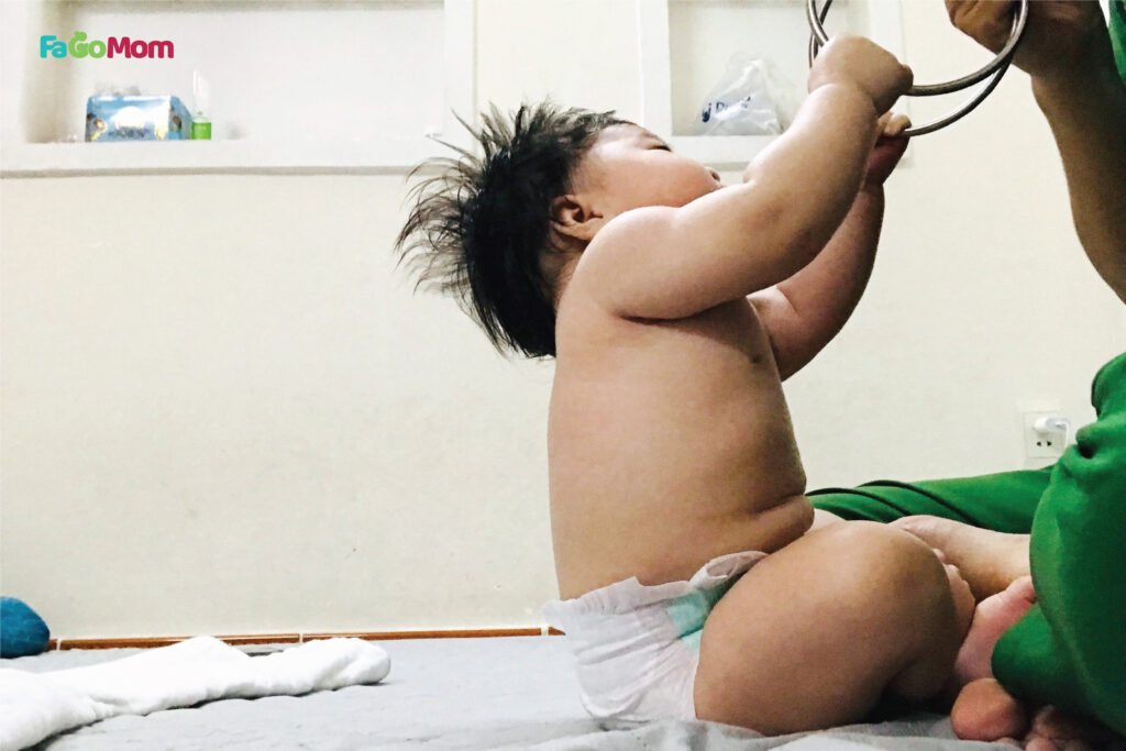 - Bài tập kéo co: Mẹ tiến hành đặt bé nằm ngừa và đưa ngón trỏ của bàn tay mình vào lòng bàn tay của bé, để bé có thể nắm chặt lấy ngón trỏ của mình. Sau đó từ từ khéo bé theo hướng ngồi dậy và từ từ thả bé về lại vị trí cũ. Mẹ cũng hết sức lưu ý tránh kéo quá mạnh hay làm bé bị đau, đặc biệt là khi thả ra thì đầu bé tiếp xúc với sàn phải nhẹ nhàng.